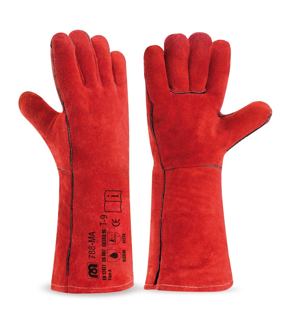 Protección contra agresiones mecánicas y calor (hasta 100ºC). Soldadura y manipulación pesada y procesos relacionados Tipo A. 40 cm de longitud. Serraje vacuno de excelente calidad con forro interior y costuras ignífugas (hilo de Meta-aramida). La piel de serraje otorga al guante una buena resistencia al corte y a la temperatura. Serraje vacuno que ofrece excelentes prestaciones mecánicas a la abrasión y al rasgado. El forro interior proporciona calidez y aislamiento térmico. Mayor durabilidad y destreza. Libres de Cromo, PCP, Bencidina y otros productos químicos prohibidos por la ley Alemana, por lo que protegen la salud del usuario y el medio ambiente. Fabricado bajo el sistema de gestión de calidad ISO:9001-2008. Calidad constante en la piel. La referencia 788M es su variante con 35 cm de longitud. Grosor medio: entre 1,2 mm