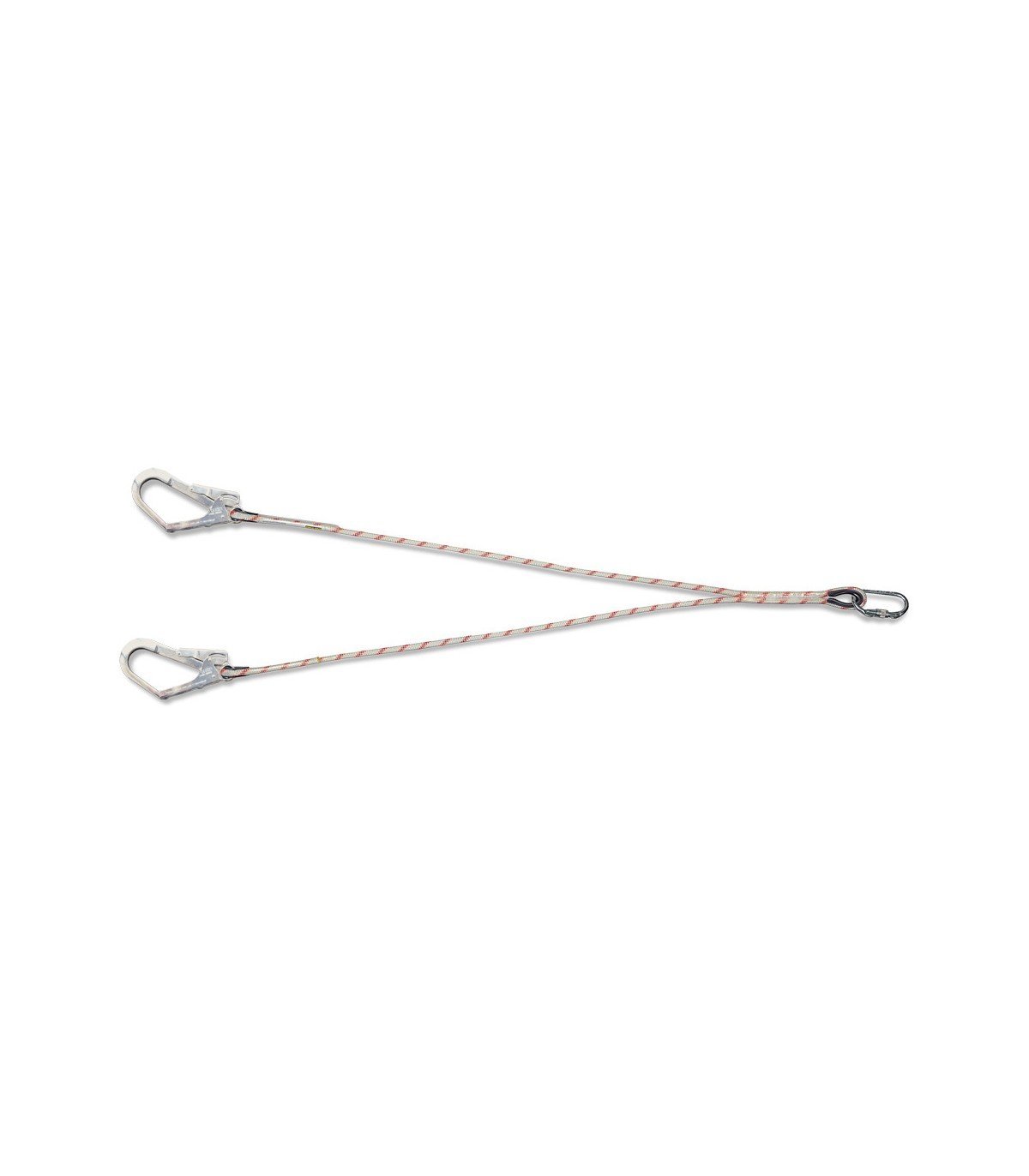 Cuerda en "Y" de 12mmØ con mosquetón acero rosca y dos mosquetones tipo gancho. Elemento de amarre de longitud fija (1,5 metros) en "Y", el cual permite siempre estar sujeto al punto de anclaje al pasar de un punto de anclaje a otro. Mosquetón de acero de cierre de rosca de 15mm apertura (para unir al arnés). 2 Mosquetones de acero tipo gancho de 55mm apertura (para puntos de anclaje). Guardacabos para reducir el roce entre los mosquetones y la cuerda, y facilitar el uso con los mosquetones.