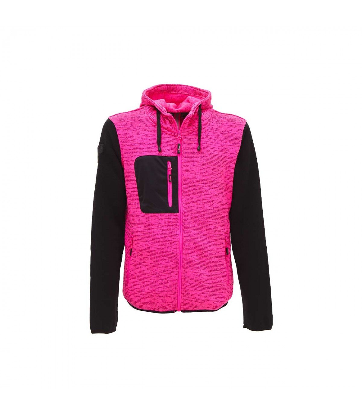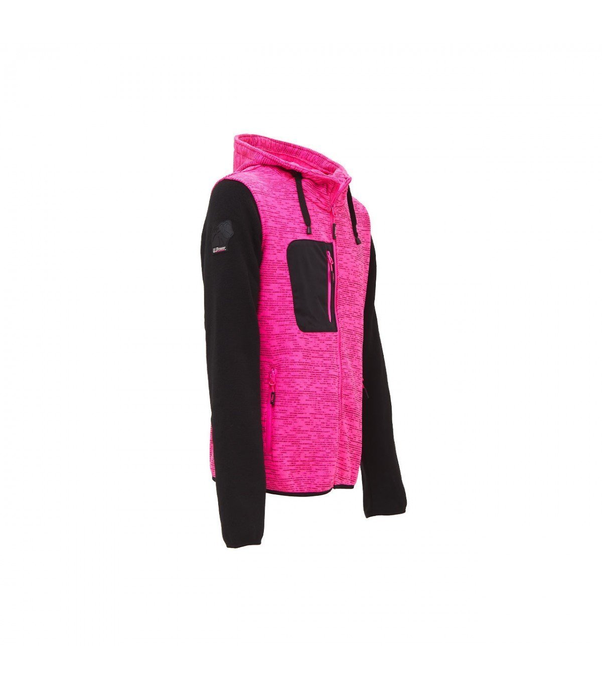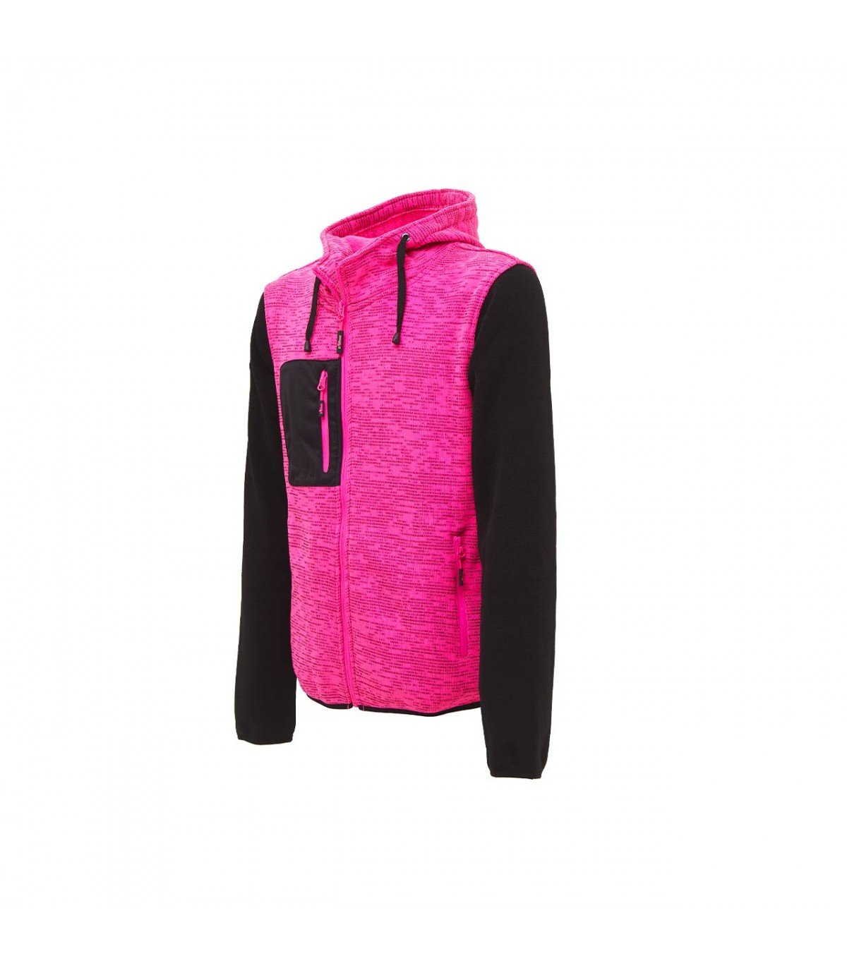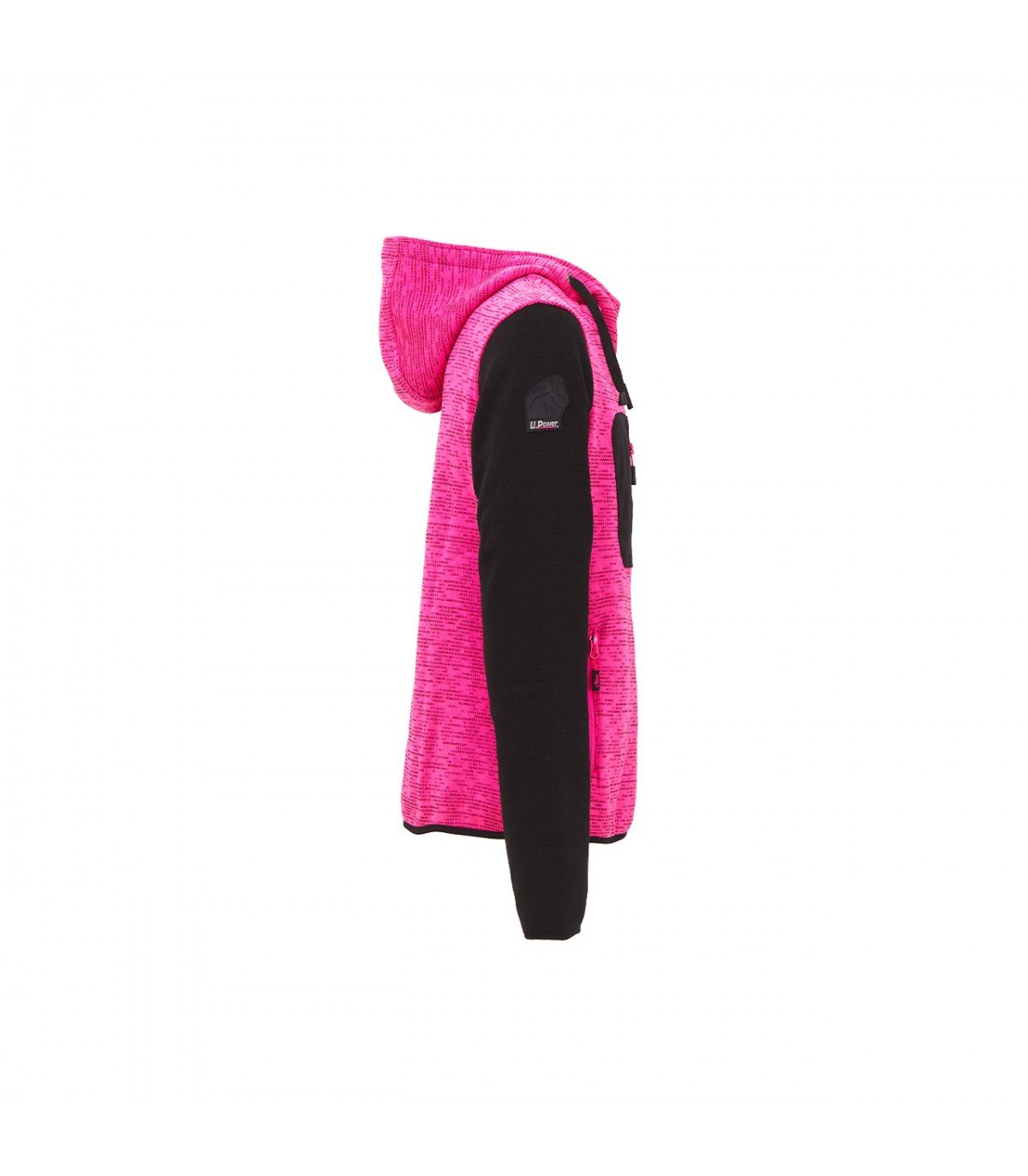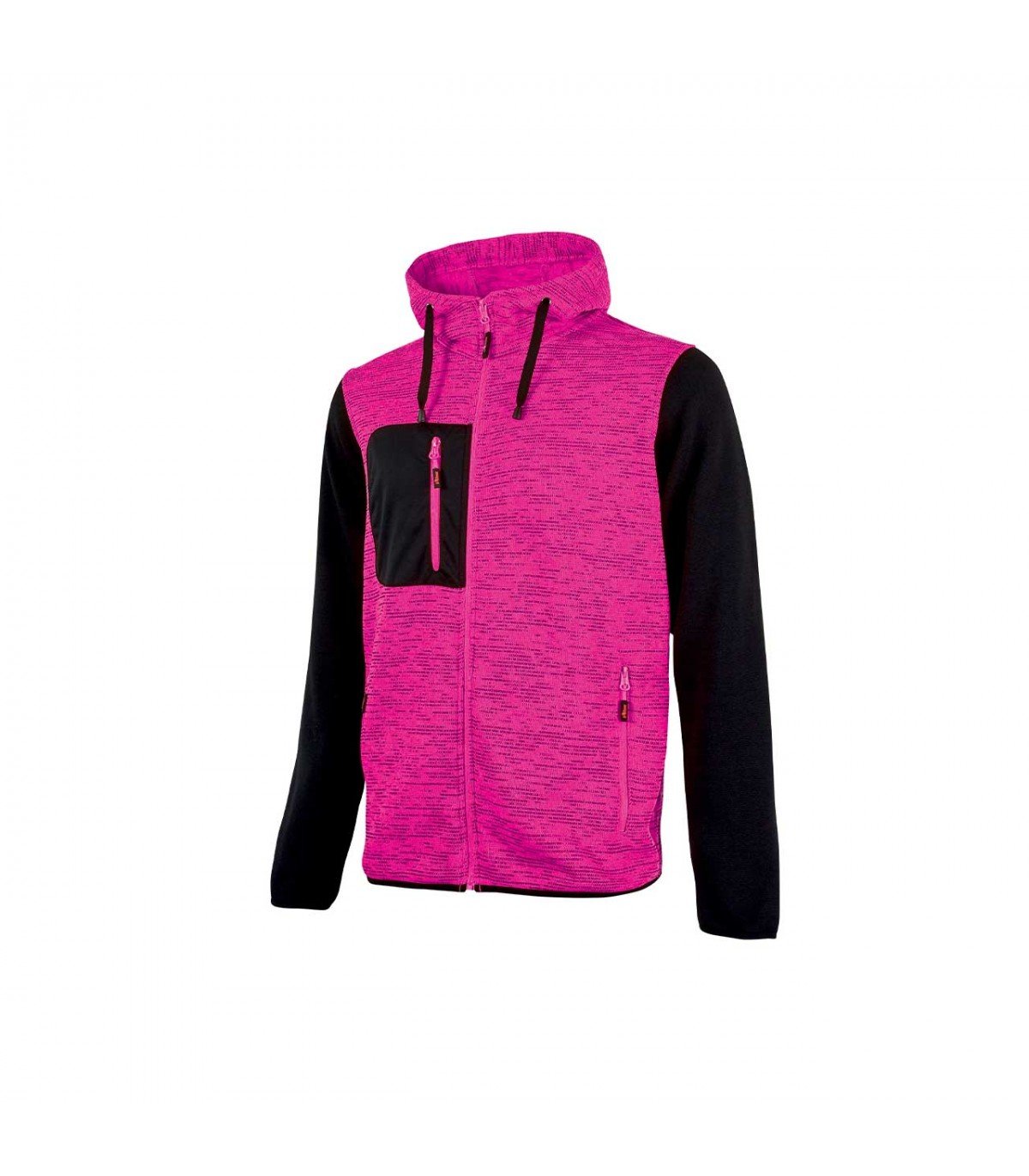 Cuello alto. Cremallera central. Puños y parte inferior en tejido stretch. Capuchón fijo y ajustable. Dos bolsillos delanteros y un bolsillo en el pecho con cremallera. Logo U-Power "Cabeza de León" tono sobre tono aplicado en el brazo derecho.