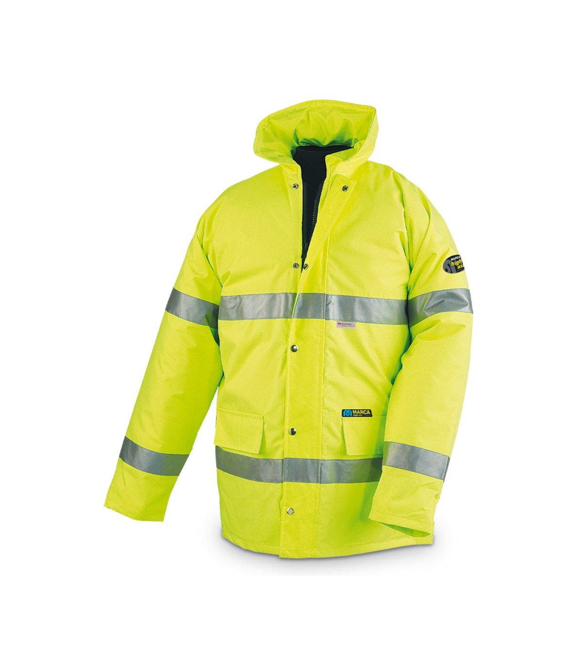 Parka amarilla o naranja fluorescente, con capucha escamoteable.