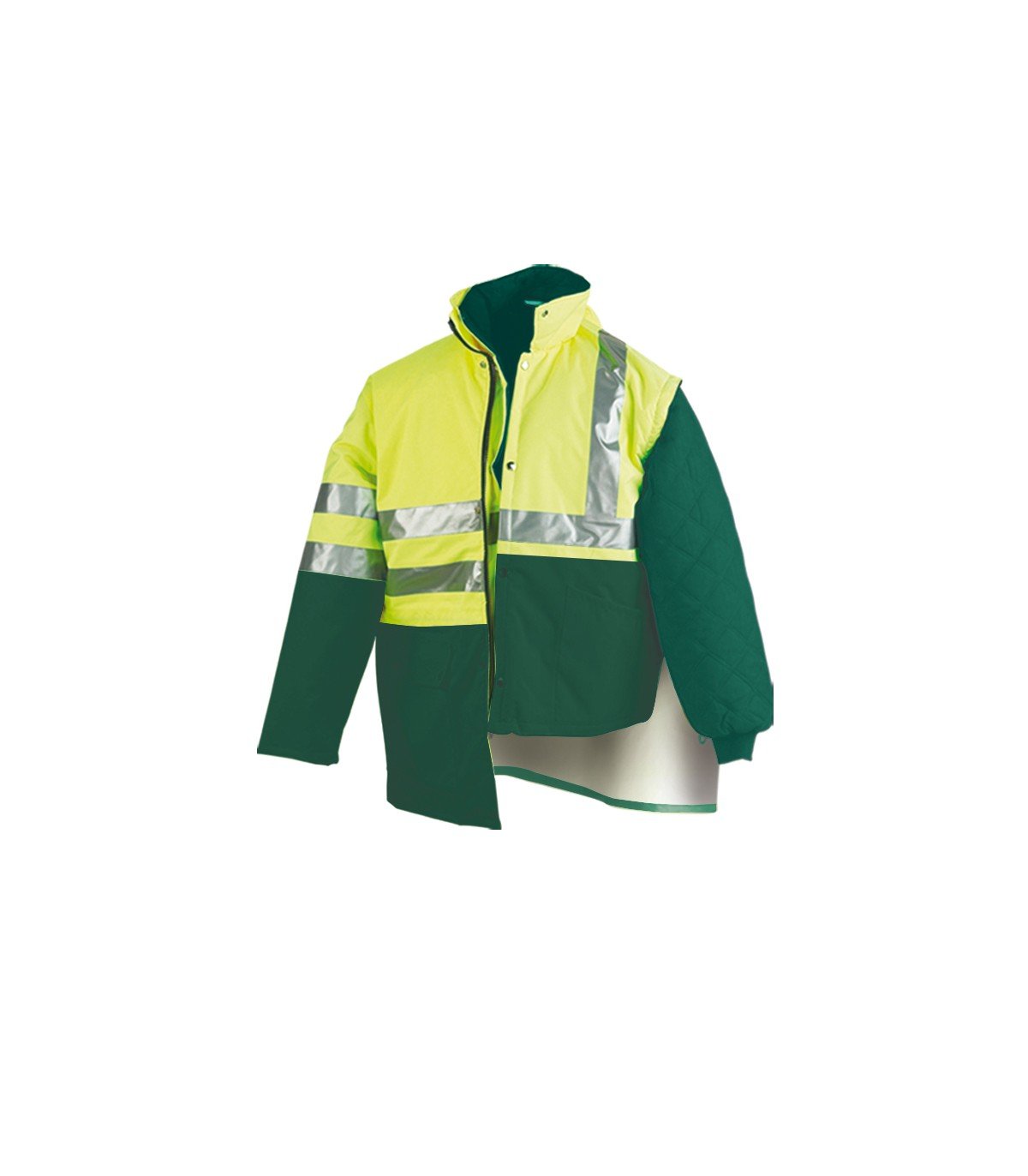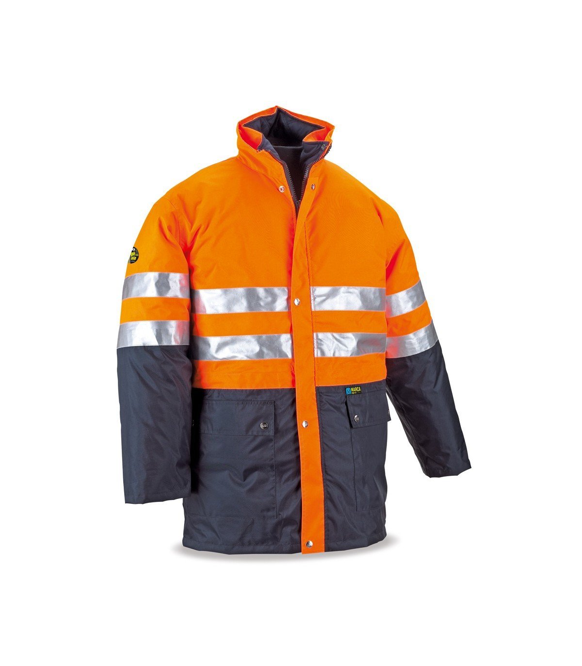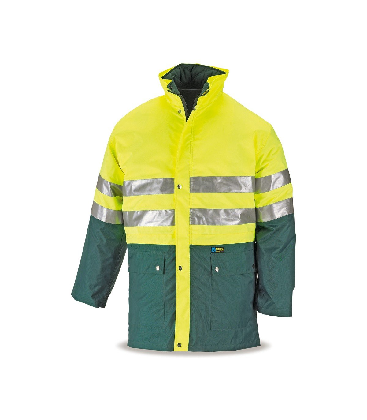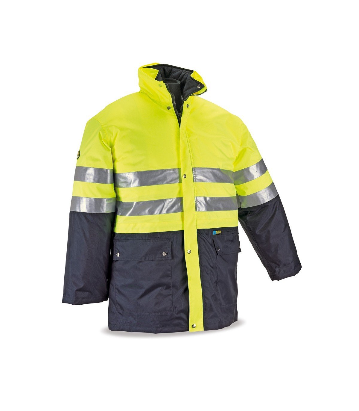 Parka de Triple uso, de alta visibilidad y lluvia, con combinaciones de color con capucha escamoteable. Disponible en Amarillo fluorescente y Azul Marino, Naranja fluorescente y Azul Marino y Amarillo fluorescente y Verde. Certificada y ensayada por Leitat O.N. nº 0162, según Reglamento (UE) bajo las normas EN ISO 13688 de Requisitos generales de Ropa de Protección, EN 343 de Ropa de protección contra la lluvia, obteniendo unos valores de 1/1/X (chubasquero) y EN ISO 20471 de Ropa de Alta Visibilidad obteniendo una clasificación de Clase 2 (chubasquero) y Clase 1 (husky o chaleco), y siendo catalogado como un EPI Categoría II.