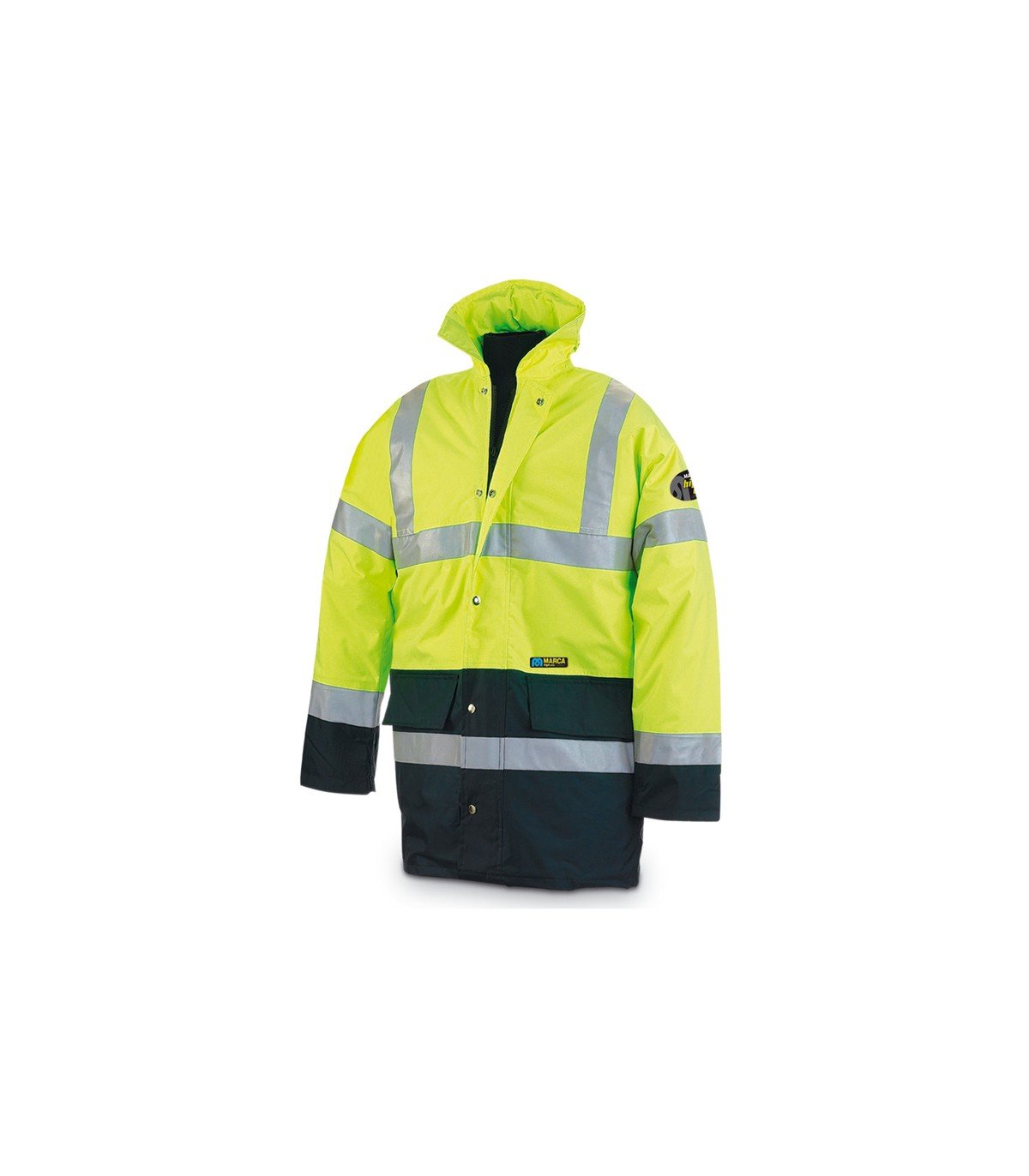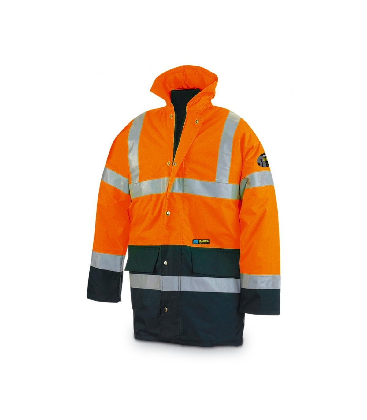 Parka amarilla o naranja fluorescente combinadas con azul marino, con capucha escamoteable en cuello, ajustable mediante cordel con tancas fijables por nudo, del mismo tejido de la prenda y con cierre por 1 punto de velcro.