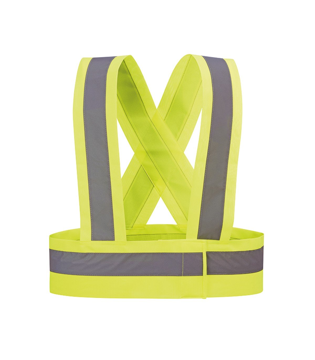 1 banda retrorreflectante horizontal ubicada en el perímetro de la cintura, y 2 bandas verticales en sendos tirantes desde la horizontal por delante y detrás.