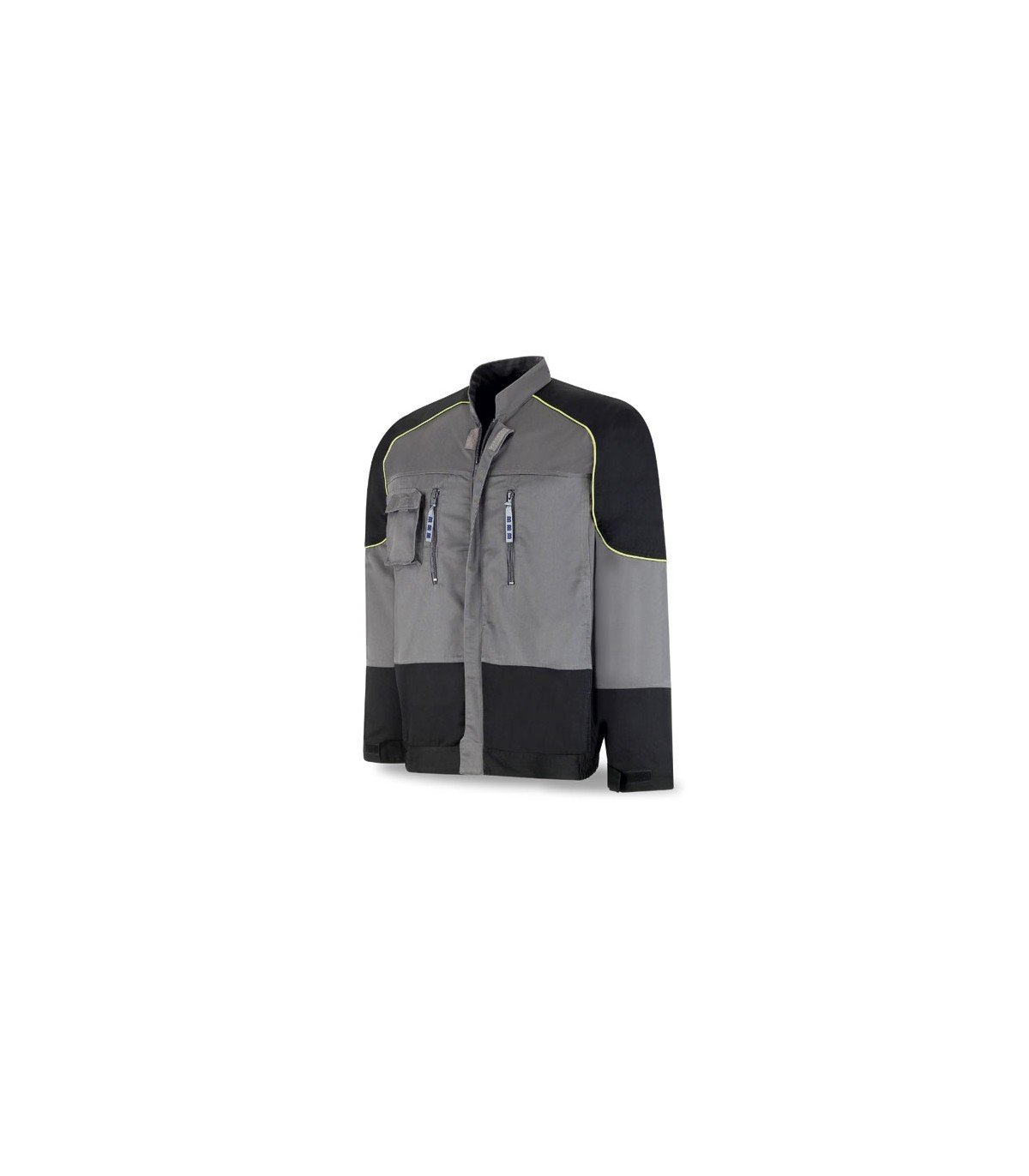 Ribetes en amarillo fluorescente. Tapeta cubre cremallera con velcro. Puños ajustables con velcro. Dos bolsillos normales. Dos bolsillos en pecho con cremallera. Bolsillo para móvil.